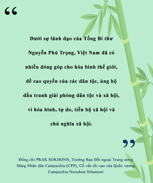 Trong khi đó, đồng chí Prak Sokhonn, Trưởng ban Đối ngoại Trung ương Đảng Nhân dân Campuchia (CPP), Cố vấn tối cao của Quốc vương Campuchia Norodom Sihamoni chia sẻ: Tổng Bí thư Nguyễn Phú Trọng với trường phái ngoại giao mang bản sắc “cây tre Việt Nam”, đã nêu bật cách tiếp cận đối ngoại và ngoại giao đặc biệt của Việt Nam trong việc duy trì hòa bình, ngăn ngừa xung đột và thúc đẩy hợp tác quốc tế trong một thế giới đang thay đổi nhanh chóng. Ngoại giao “cây tre Việt Nam” đã đóng vai trò quan trọng trong việc phát triển học thuyết và chính sách đối ngoại của Việt Nam, đặc biệt là trong bối cảnh còn nhiều phức tạp, phụ thuộc lẫn nhau và dễ bị tổn thương.