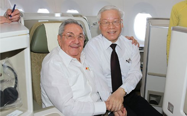 | Tổng Bí thư Nguyễn Phú Trọng cùng đồng chí Raul Castro Ruz trên chuyên cơ bay từ thủ đô La Habana tới thành phố Santiago de Cuba. Ảnh: TTXVN |