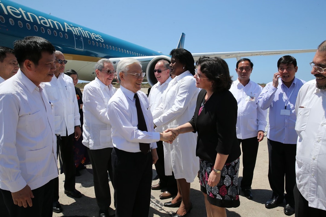 | Tổng Bí thư Nguyễn Phú Trọng cùng Bí thư Thứ nhất Ban chấp hành Trung ương Đảng Cộng sản Cuba, Chủ tịch Hội đồng Nhà nước và Hội đồng Bộ trưởng Cộng hòa Cuba Raul Castro Ruz đến sân bay Quốc tế Antonio Maceo, thành phố Santiago de Cuba. Ảnh: Trí Dũng/TTXVN |
