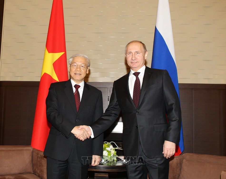 | Tổng thống Liên bang Nga Vladimir Putin đón Tổng Bí thư Nguyễn Phú Trọng trong chuyến thăm chính thức Nga năm 2014. Ảnh: Trí Dũng/TTXVN |
