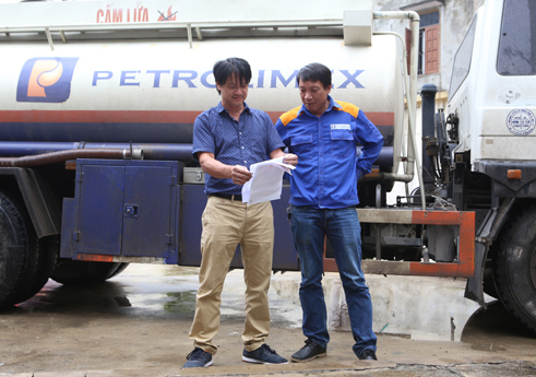Anh Lưu Bá Vang (bên trái) kiểm tra chứng từ nhập xăng dầu tại cửa hàng (ảnh: Nguyễn Bằng)