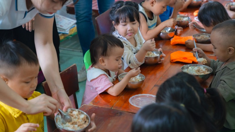 | Một bữa ăn có thịt của các em nhỏ mầm non |