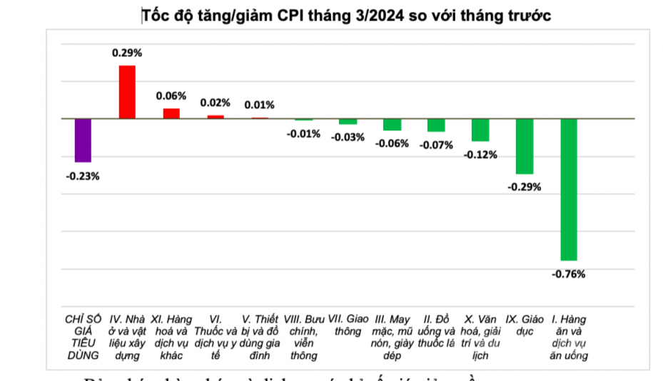 Cụ thể, trong mức giảm 0,23% của CPI tháng 3/2024 so với tháng trước, có 7 nhóm hàng hóa và dịch vụ có chỉ số giá giảm và 4 nhóm hàng có chỉ số giá tăng. Trong 7 nhóm hàng hoá và dịch vụ giảm giá trong tháng 3/2024, nhóm hàng ăn và dịch vụ ăn uống giảm mạnh nhất với mức 0,76%, tác động làm CPI chung giảm 0,25 điểm phần trăm.