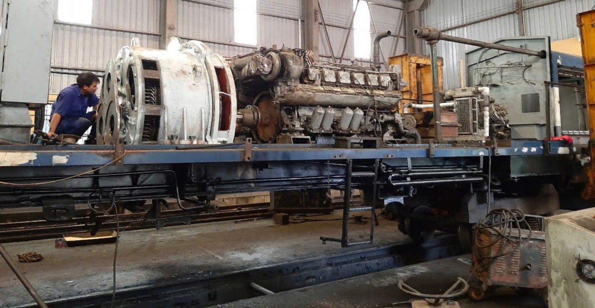 | Đầu máy D13E-725 cải tạo đầu tiên đang thi công lắp đặt động cơ diesel và máy phát điện chính - Ảnh: Nhóm nghiên cứu cung cấp |