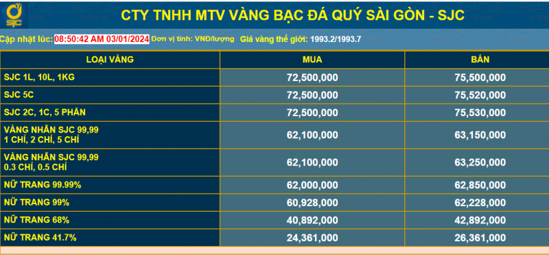 Thời điểm 15h30 chiều ngày 3/1/2024, giá vàng SJC tại Công ty TNHH MTV Vàng Bạc Đá quý Sài Gòn - SJC niêm yết chiều mua vào ở mức 72,5 triệu đồng/lượng mua vào và 75,5 triệu đồng/lượng bán ra. Chênh lệch giá mua bán tại đơn vị này đang là 3 triệu đồng.