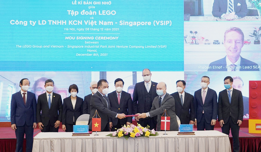 | Tập đoàn LEGO (Đan Mạch) ký biên bản ghi nhớ hợp tác với Công ty liên doanh TNHH Khu công nghiệp Việt Nam - Singapore (VSIP) xây dựng nhà máy mới trị giá hơn 1 tỷ USD tại tỉnh Bình Dương. Ảnh: Hà Nguyễn |