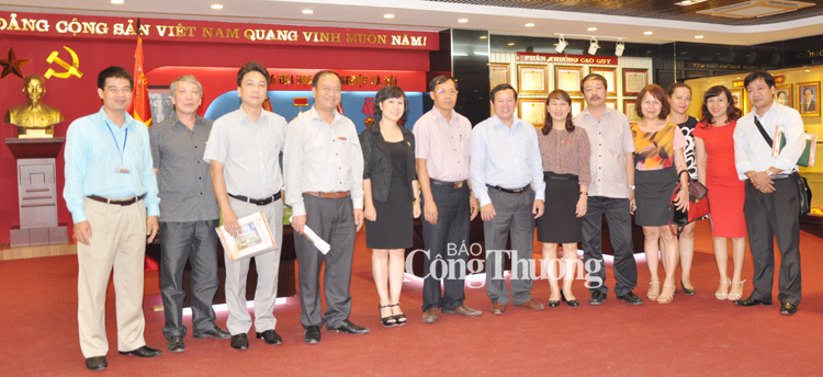| Đoàn Báo Công Thương chụp ảnh lưu niệm cùng đại diện Ban Giám hiệu nhà trường |