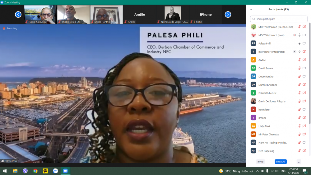 Về phía Nam Phi, bà Palesa Phili, Chủ tịch Phòng Thương mại và Công nghiệp Durban, Nam Phi bày tỏ sự vui mừng và mong muốn được thúc đẩy quan hệ hợp tác với các đối tác Việt Nam. Tỉnh Durban, Nam Phi với cảng Richards Bay là cửa ngõ lớn nhất chuyên phục vụ xuất khẩu than của Nam Phi. Các doanh nghiệp cung ứng và kinh doanh than Nam Phi đều đặt Văn phòng, Chi nhánh tại đây để thuận tiện giao dịch và xử lý các vấn đề liên quan tới xuất nhập khẩu tại cảng Richards Bay. Bà Palesa Phili khẳng định sẽ ủng hộ và tích cực thúc đẩy việc kết nối, giới thiệu các đối tác, hỗ trợ doanh nghiệp Việt Nam nhập khẩu than từ Nam Phi trong thời gian tới.