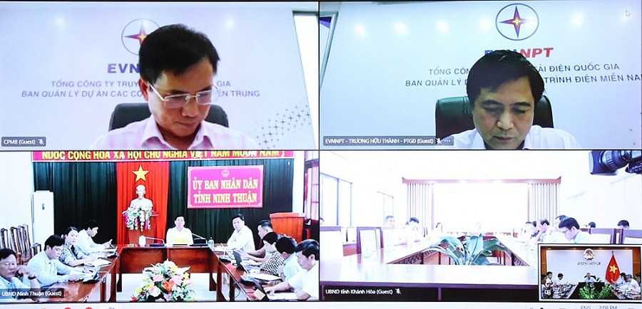 | Cuộc họp được tổ chức trực tuyến kết nối tới UBND tỉnh Khánh Hòa, Ninh Thuận và công trường dự án |