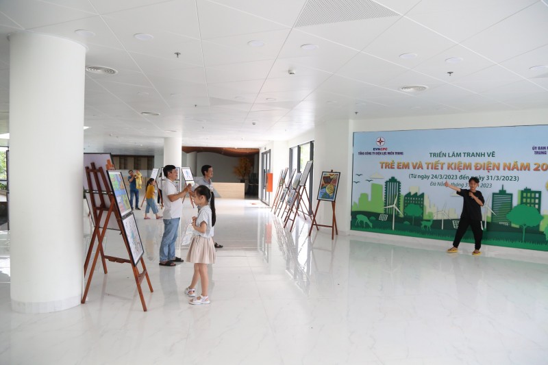 | Các tác phẩm tranh vẽ hưởng ứng cuộc thi tuyên truyền tiết kiệm điện được triển lãm tại tòa nhà EVNCPC. |