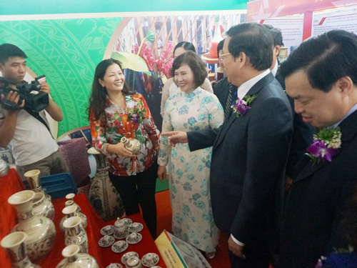 Ông Vũ Trọng Kim - Phó Chủ tịch kiêm Tổng thư ký UBTWMTTQ Việt Nam và Thứ trưởng Bộ Công Thương Hồ Thị Kim Thoa thăm gian hàng triển lãm |