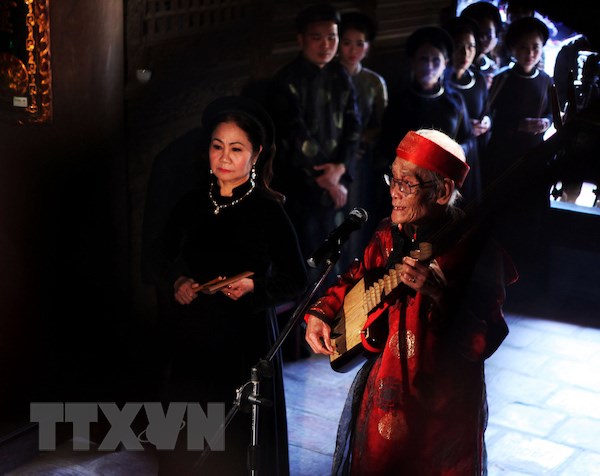| Nghệ nhân ưu tú Nguyễn Phú Đẹ (phải) trong lĩnh vực ca trù được đề nghị xét tặng danh hiệu nghệ nhân nhân dân. (Ảnh: TTXVN) |