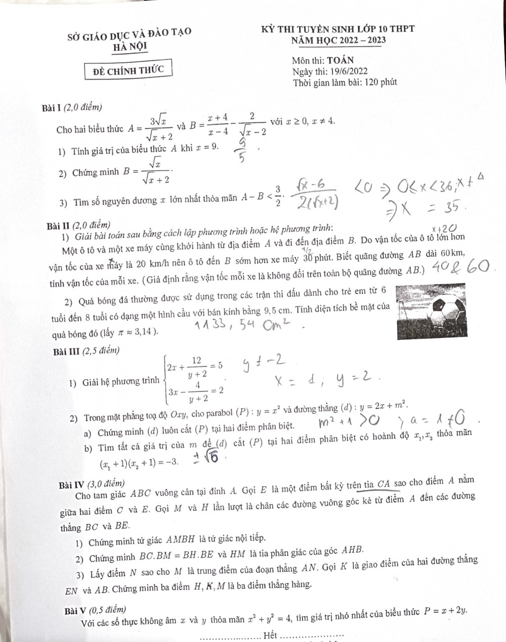 Sau đây là đề thi Toán vào lớp 10 tại Hà Nội năm 2022: