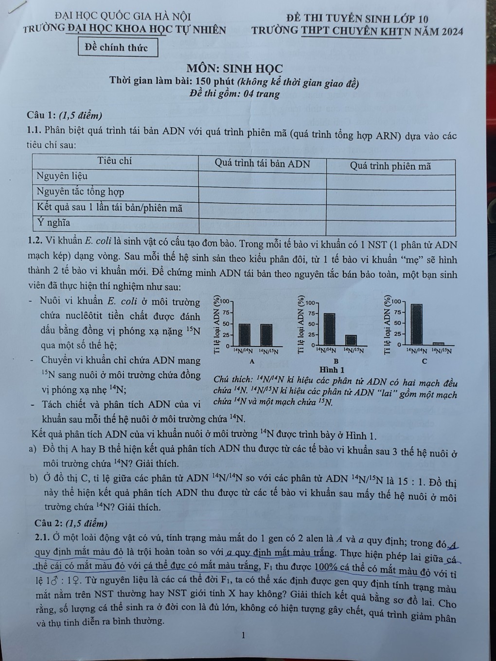 | Đề thi môn Sinh học, kỳ thi vào lớp 10 Trường chuyên Khoa học Tự nhiên. |