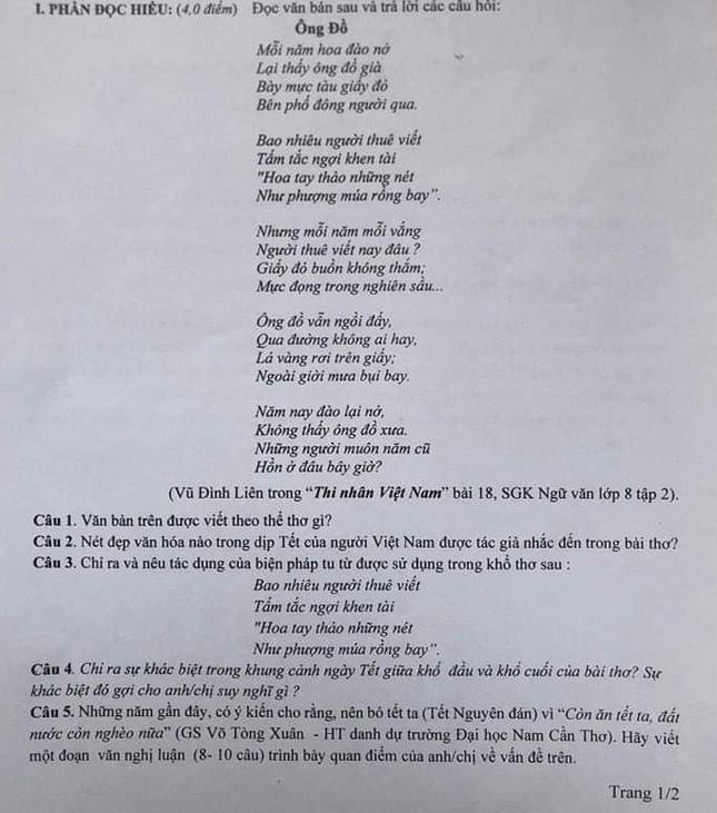 Đáng chú ý, câu 5 trong đề bài yêu cầu học sinh viết một đoạn văn nghị luận (8-10 câu), bày tỏ quan điểm về ý kiến cho rằng nên bỏ tết ta (Tết Nguyên đán) vì ‘còn ăn tết ta, đất nước còn nghèo nữa’ (giáo sư Võ Tòng Xuân, Hiệu trưởng danh dự Trường Đại học Nam Cần Thơ).