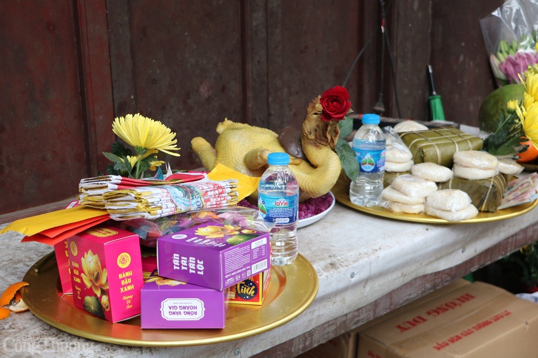 | Mâm lễ được chuẩn bị thịnh soạn, không thể thiếu bánh chưng và bánh dày, hai vật phẩm gắn với câu chuyện về hoàng tử Lang Liêu dưới thời Hùng Vương thứ 6 |