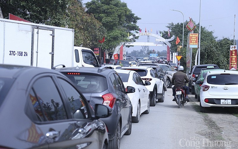Con đường vào đền ông Hoàng Mười chật kín phương tiện đi lễ đầu xuân Quý Mão 2023. |