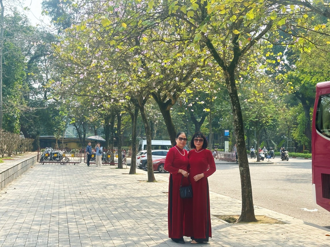 | Cô H.D (quận Hoàn Kiếm, Hà Nội) cho biết: Chẳng cần phải di chuyển lên Tây Bắc xa xôi, ngay tại Thủ đô cũng dễ dàng chiêm ngưỡng vẻ đẹp của hoa ban. Thấy hoa ban nở rộ, cô và bạn cô đã rủ nhau mặc áo dài truyền thống chụp ảnh với loài hoa này. |