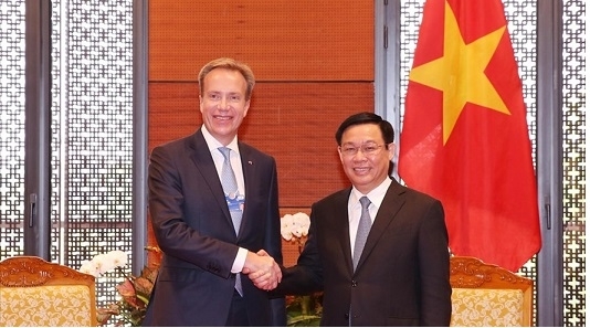| Deputy PM Vuong Dinh Hue (R) receives WEF President Borge Brende - Photo: laodong.vn |