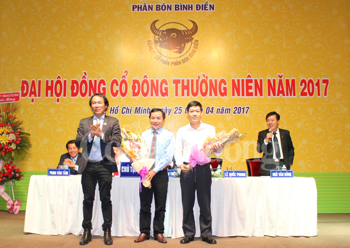 | Ông Lê Quốc Phong - Tổng giám đốc Phân bón Bình Điền tặng hoa chúc mừng 2 thành viên ban kiểm soát mới |