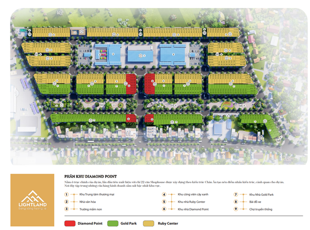 Phân khu Diamond Point nằm ở trục chính của dự án Lightland Hải Tiến, lần đầu tiên xuất hiện với chỉ 22 căn Shophous giá trị khác biệt, được xây dựng theo kiến trúc châu Âu tạo nên điểm nhấn kiến trúc, cảnh quan cho dự án, pháp lý rõ ràng. Nơi đây tập trung những cửa hàng kinh doanh sầm uất bậc nhất khu vực. Với ý tưởng “Không gian sáng tạo”, đề cao khả năng sáng tạo, thể hiện cái “Tôi” của gia chủ, các mẫu nhà được thiết kế và hoàn thiện mặt ngoài theo lối kiến trúc châu Âu hiện đại. Không gian bên trong được gia chủ tự thiết kế nhưng vẫn đảm bảo tối ưu cho mục đích kinh doanh kết hợp để ở.
