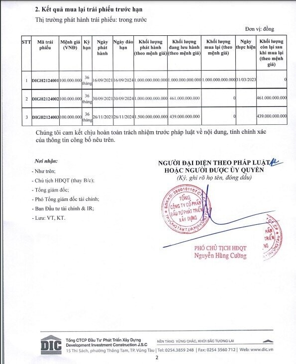 Theo công bố mới đây, Tổng Công ty Cổ phần Đầu tư Phát triển Xây dựng (DIC Corp; cổ phiếu DIG) đã công bố kết quả mua lại trái phiếu trước hạn đối với lô trái phiếu DIGH2124001. Theo đó, DIC Corp đã mua lại toàn bộ 1.000 tỷ đồng trái phiếu đang lưu hành của lô DIGH2124001.