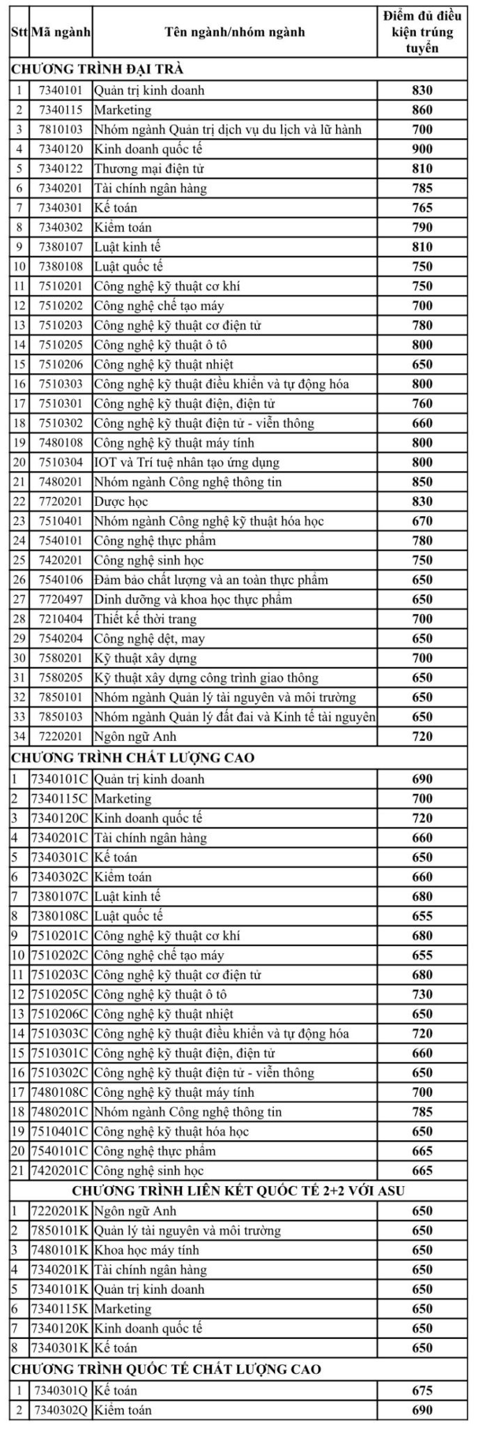 Phương thức xét điểm thi đánh giá năng lực vào các ngành/nhóm ngành chương trình chất lượng cao tại cơ sở TP.Hồ Chí Minh, có điểm chuẩn từ 650 đến 785 điểm.
