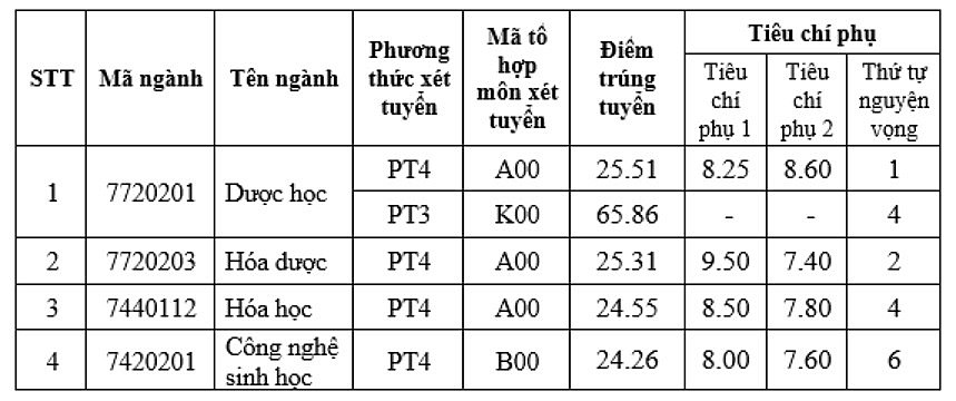 Theo thông báo của Đại học Dược Hà Nội chiều 17/8 về điểm chuẩn đại học năm 2024, ngành Dược học dẫn đầu với 25,51 điểm, tăng 0,51 so với năm ngoái. Theo sau là ngành Hóa Dược với 25,31 điểm (tăng 0,41). Hai ngành Hóa học và Công nghệ sinh học cùng lấy trên 24 điểm, tăng lần lượt 0,7 và 0,05.