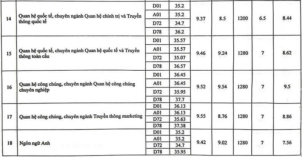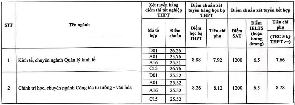 Với thang 40, ngưỡng trúng tuyển cao nhất là 38,12 tại ngành Lịch sử, tổ hợp C19 (Ngữ văn, Giáo dục công dân và Lịch sử). Ngôn ngữ Anh, tổ hợp D72 (Ngữ văn, Khoa học tự nhiên, Tiếng Anh) thấp nhất với 34,7.