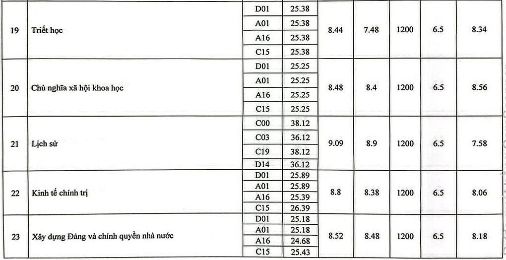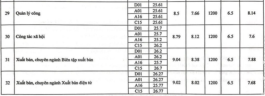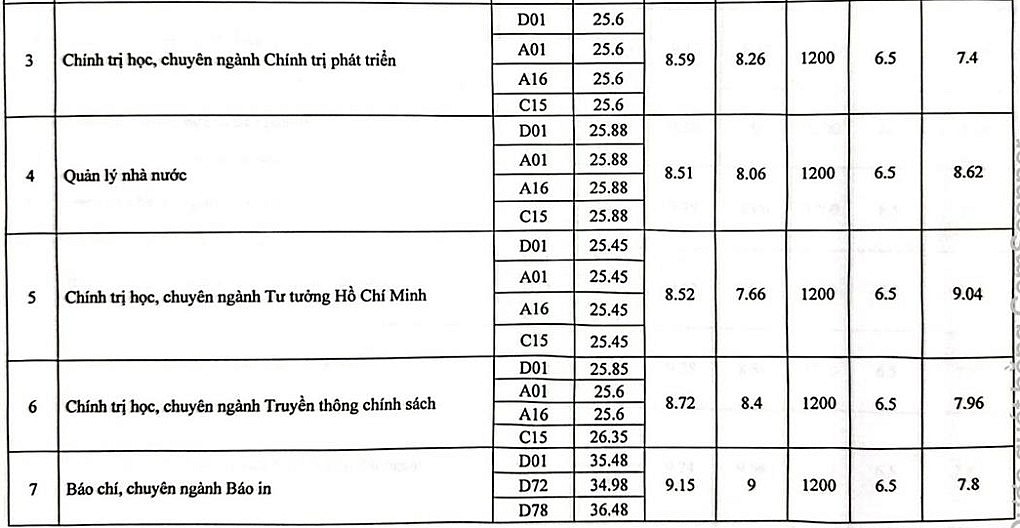 Ngành Xây dựng Đảng và chính quyền nhà nước lấy 24,68 tại tổ hợp A16 (Toán, Văn và Khoa học Tự nhiên), thấp nhất trong thang này. Các ngành khác gần như không dưới 25.