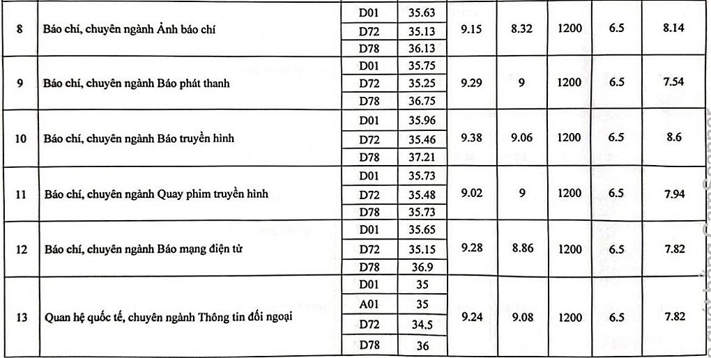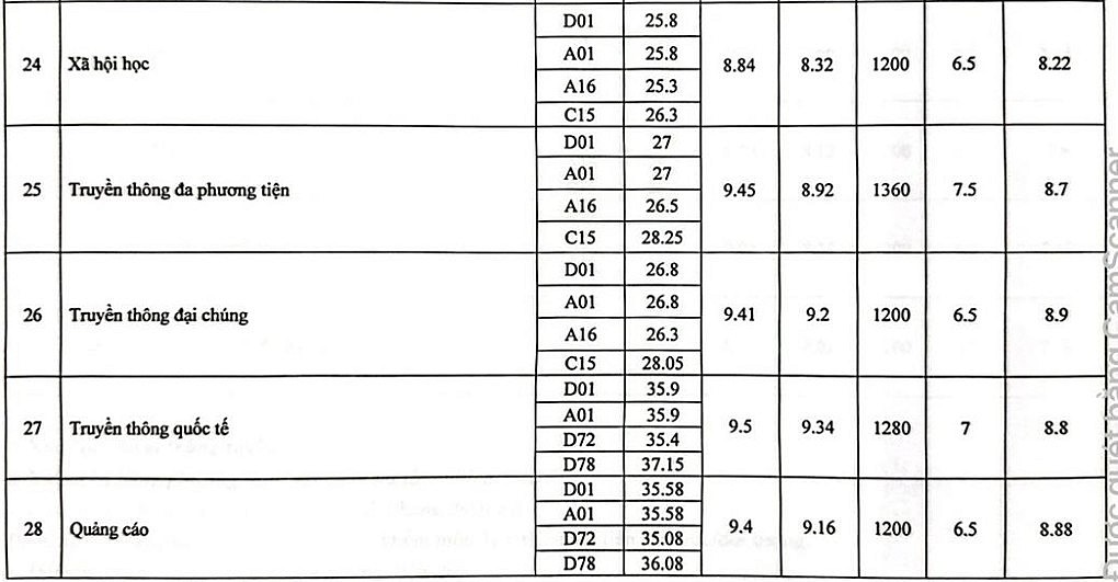 Ở thang 30, ngành Truyền thông đa phương tiện lấy cao nhất với 28,25 ở tổ hợp C15 (Ngữ Văn, Toán học và Khoa học xã hội). Theo sau là ngành Truyền thông đại chúng, cũng ở tổ hợp này, với 28,05.