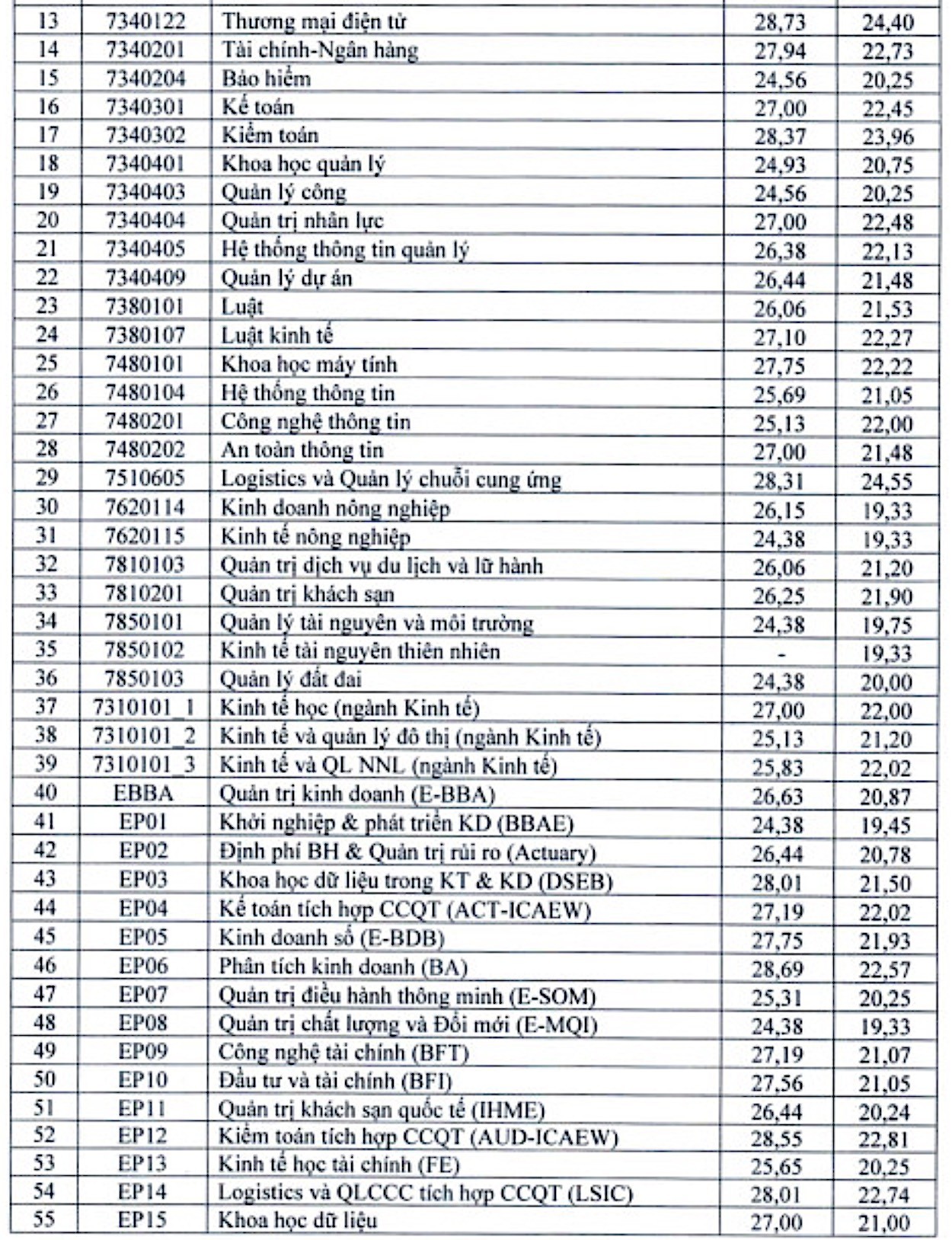 Những ngành lấy điểm chuẩn 19,33 - thấp nhất của nhóm này là Thẩm định giá (hệ POHE), Quản trị chất lượng và Đổi mới, Kinh tế tài nguyên thiên nhiên, Kinh tế nông nghiệp.