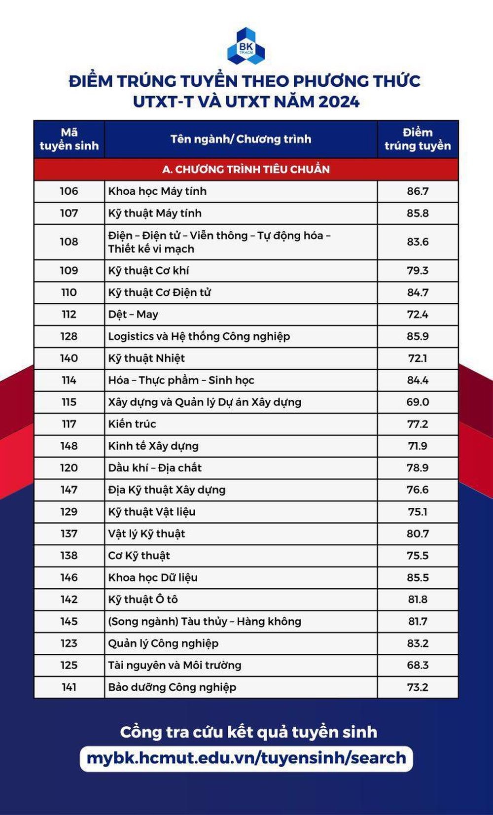 Trong tổng số 44 ngành xét tuyển có 6 ngành lấy điểm chuẩn trên 85 và 21 ngành có điểm chuẩn trên 81 (trung bình mỗi môn trong tổ hợp xét tuyển phải đạt 9.0 điểm). Ngành có điểm chuẩn cao nhất là ngành Khoa học Máy tính, chương trình tiêu chuẩn với tổng điểm 86.7.
