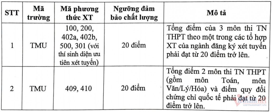 - Xét tuyển thẳng, ưu tiên xét tuyển theo quy định hiện hành của Bộ GD-ĐT và quy định của Trường - Mã phương thức xét tuyển 301.