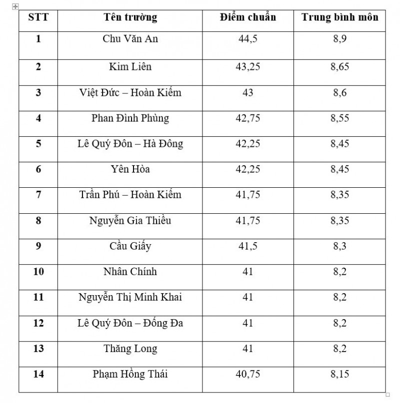 Có 2 trường bằng điểm nhau (41,75 điểm) là THPT Trần Phú - Hoàn Kiếm và THPT Nguyễn Gia Thiều; 4 trường cùng 41 điểm (THPT Nhân Chính, THPT Nguyễn Thị Minh Khai và THPT Lê Quý Đôn – Đống Đa, THPT Thăng Long).
