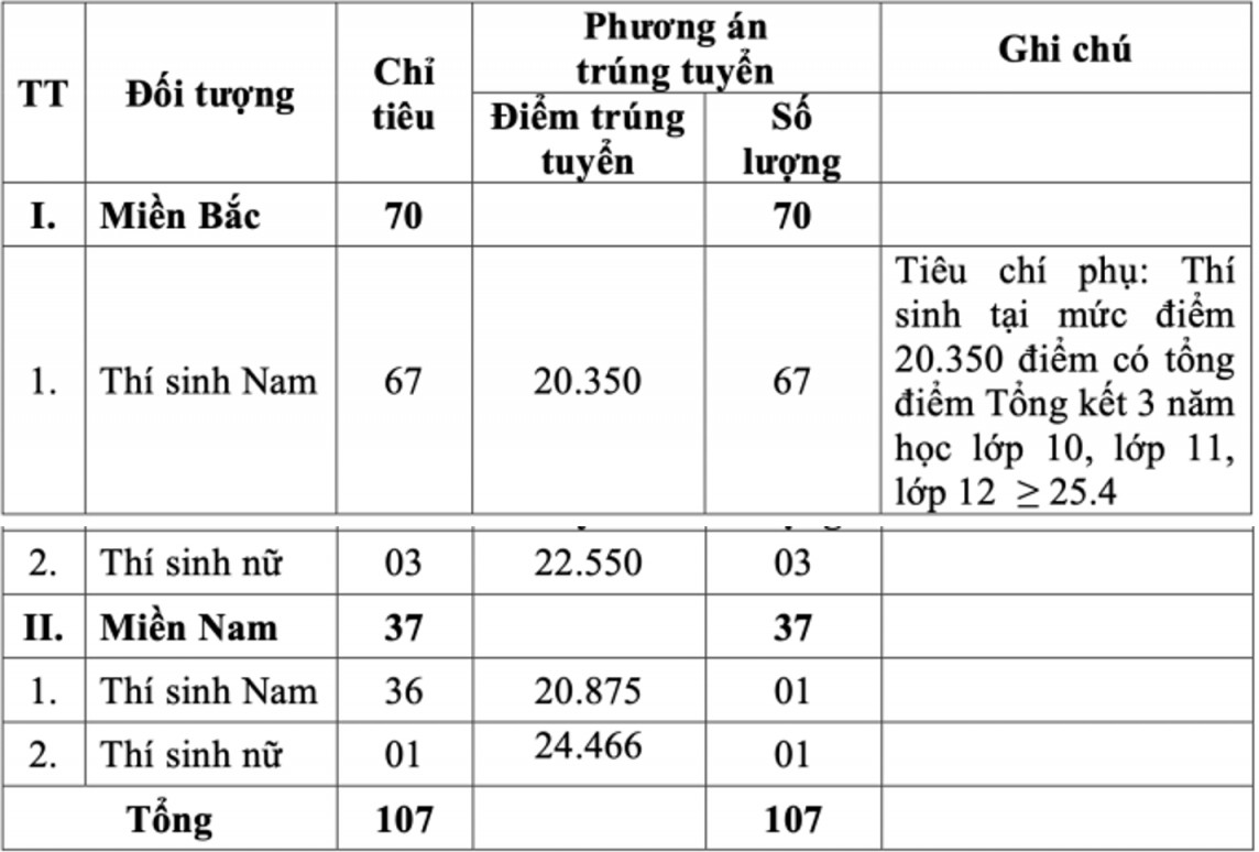 Theo đó, điểm trúng tuyển với nam miền Bắc là 20,350 điểm, miền Nam là 20,875 điểm. Với nữ miền Bắc là 22,550 điểm, miền Nam là 24,466 điểm.