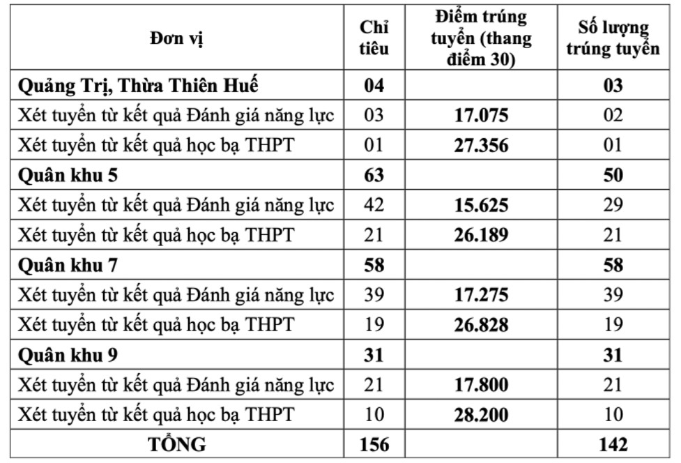 17 trường quân đội năm nay tuyển hơn 5.300 sinh viên, tăng gần 1.000 so với năm ngoái. Ngoài phương thức tuyển thẳng và xét điểm thi tốt nghiệp THPT, lần đầu khối trường này xét điểm thi đánh giá năng lực và học bạ. Với xét học bạ, thí sinh cần có điểm tổng kết mỗi năm ở THPT từ 7 trở lên, riêng các môn trong tổ hợp xét tuyển đạt tối thiểu 7,5. Cùng đó, thí sinh cần vượt qua vòng sơ tuyển ở địa phương. Tổng chỉ tiêu xét tuyển sớm là gần 2.200. Chiều 9/7, Ban tuyển sinh Quân sự cho biết dù có hơn 2.500 thí sinh đăng ký, số đủ điều kiện trúng tuyển chỉ khoảng 950 người. Năm ngoái, điểm chuẩn theo kết quả thi tốt nghiệp vào các trường quân đội từ 16,25 đến 27,97. Học viện Khoa học quân sự lấy cao nhất, thấp nhất là trường Sĩ quan Công binh. |