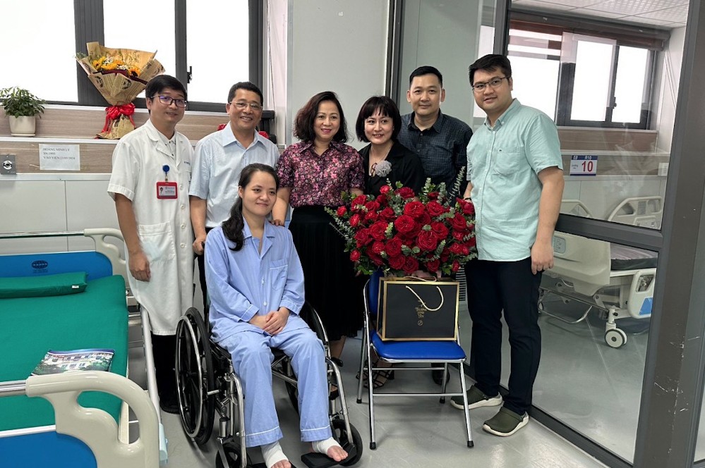 Ngày 30/7, GS.TS Lê Văn Quảng - Giám đốc Bệnh viện K, cùng đại diện các đơn vị thuộc bệnh viện tới động viên, chúc mừng nữ bác sĩ Hoàng Minh Lý (người bị tai nạn hy hữu tại quán cà phê The Coffee House) đã hồi phục sức khỏe sau thời gian điều trị, phục hồi chức năng, chuẩn bị ra viện.