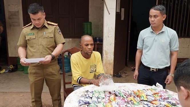 Trước đó, vào hồi 16h40 ngày 10/4/2025, tại sân bay quốc tế thuộc bản Hạt Nghiên, thành phố Luông-pha-băng (tỉnh Luông-pha-băng), tổ công tác của Công an tỉnh Điện Biên và Phòng Cảnh sát Công an tỉnh Luông-pha-băng đã phát hiện, bắt quả tang đối tượng ABLI RUCA (SN 1975, quốc tịch Nigeria) về hành vi cất giấu 4,8kg heroin, được ngụy trang tinh vi trong vỏ bánh ngọt, cất giấu trong hành lý cá nhân.