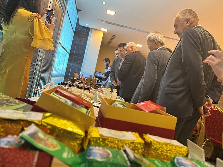Hướng dẫn khách thăm quan các sản phẩm xuất khẩu tiêu biểu của hơn 150 doanh nghiệp, ông Trần Trọng Kim giới thiệu một số mặt hàng có thế mạnh gồm gạo, hạt điều, cà phê, hạt tiêu, trầm hương, vật liệu xây dựng, đá marbles, gạch ốp lát, thủy sản, rau quả đóng hộp,…. đều có chất lượng tốt, phù hợp với nhu cầu thị trường sở tại.