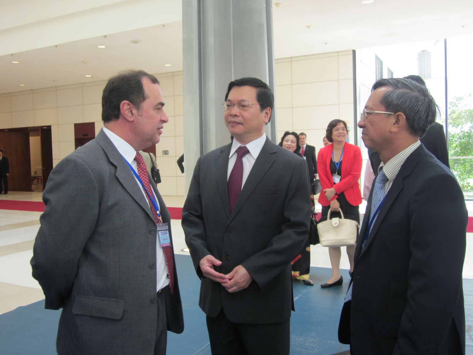 Bộ trưởng Bộ Công Thương Vũ Huy Hoàng (đứng giữa) trao đổi với đại diện của Uruguay