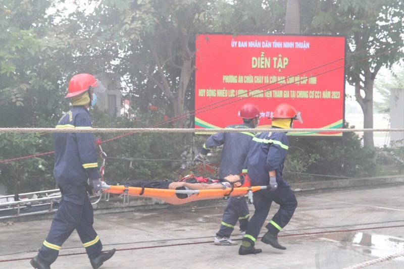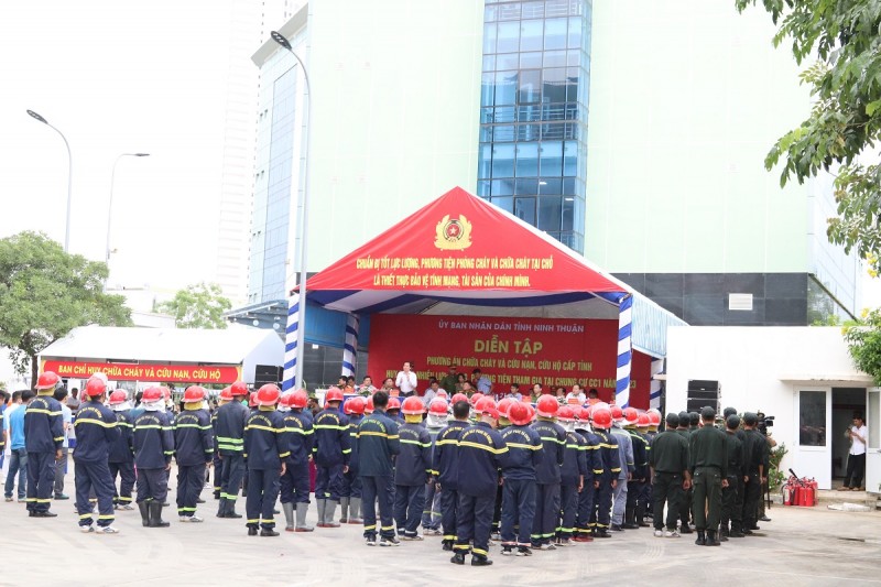 Các đơn vị tham gia diễn tập gồm: Phòng Cảnh sát PCCC&CNCH Công an tỉnh Ninh Thuận; UBND thành phố Phan Rang - Tháp Chàm; Trung đoàn không quân 937; Bệnh viện đa khoa tỉnh Ninh Thuận; Công ty Điện lực Ninh Thuận; Công ty Cổ phần Cấp nước Ninh Thuận; Công ty Công trình Đô thị Ninh Thuận; Nhà máy Nhiệt điện Vĩnh Tân 4; Ban Chỉ huy, đội PCCC&CNCH cơ sở, toàn bộ cư dân chung cư CC1 và nhiều CBCNV cùng sự phối hợp của Công an tỉnh Khánh Hòa và Bình Thuận. Nhiều phương tiện chuyên nghiệp, hiện đại đã được huy động tham gia như: Xe chữa cháy, xe cứu thương, xe thang cứu hộ, xe bồn chở nước, máy phát điện, máy nạp khí sạch, máy bơm chữa cháy, máy bơm nước, đệm hơi và cầu trượt...