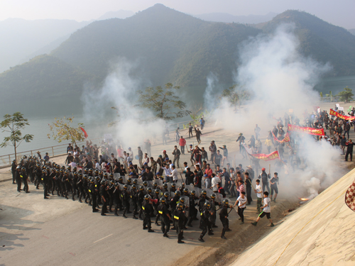 Nội dung diễn tập gồm 2 tình huống giả định: Tình huống 1 là giải tán đám đông gây rối an ninh trật tự, bạo loạn chính trị. Tình huống đặt ra là nhân dân huyện Mường La tỉnh Sơn La, thuộc khu vực giải phóng mặt bằng để xây dựng Công trình thủy điện Sơn La không đồng tình với chính sách đền bù, đã tụ tập đông người đến trụ sở Nhà máy thủy điện Sơn La đòi Giám đốc Công ty thủy điện Sơn La bồi thường, đền bù cho nhân dân. Mặc dù đã được các Phòng chức năng của Công ty giải thích và trả lời rất rõ ràng là việc đền bù giải phóng mặt bằng, di dân tái định cư của công trình thủy điện Sơn La thuộc chức năng, nhiệm vụ của UBND tỉnh Sơn La và trực tiếp là UBND huyện Mường La. Công ty thủy điện Sơn La chỉ có chức năng quản lý, vận hành nhà máy. Hướng dẫn bà con lên gặp UBND huyện Mường La, cao hơn là UBND tỉnh Sơn La để được giải quyết các thắc mắc và đề nghị bà con nhân dân giải tán để đảm bảo giao thông đi lại, không cản trở công tác sản xuất, vận hành của Nhà máy. Nhưng một số đối tượng quá khích đã cố tình không hiểu, lôi kéo nhân dân đập phá trụ sở Công ty, gây mất an ninh trật tự, bạo loạn chính trị. Trước tình hình đó Công ty đã huy động lực lượng bảo vệ của Công ty, đồng thời báo cáo lãnh đạo công an tỉnh để huy động lực lượng công an vũ trang giải tán đám đông bảo vệ nhà máy.