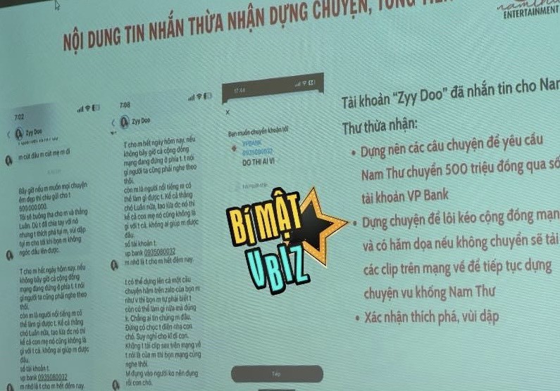 Nam Thư cho biết, trong thời gian qua cô chọn cách im lặng để thu thập đủ thông tin và bằng chứng, phục vụ cho công tác điều tra của cơ quan chức năng. Tại buổi chia sẻ, cô đã cung cấp nhiều bằng chứng để chứng minh mình bị vu khống, bao gồm các tin nhắn trò chuyện với tài khoản Z.D. Theo đó, Z.D đã thừa nhận dựng chuyện để yêu cầu Nam Thư chuyển 500 triệu đồng, đồng thời hăm dọa sẽ tải các clip trên mạng về để tiếp tục vu khống nếu không nhận được tiền.