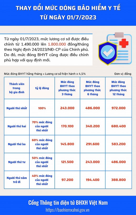 Bảo hiểm Xã hội Việt Nam cho biết, từ ngày 1/7/2023, mức lương cơ sở được điều chỉnh từ 1.490.000 lên 1.800.000 đồng/tháng theo Nghị định 24/2023/NĐ-CP của Chính phủ. Theo đó, từ ngày 1/7/2023, mức đóng bảo hiểm y tế cũng được điều chỉnh phù hợp với quy định mới.