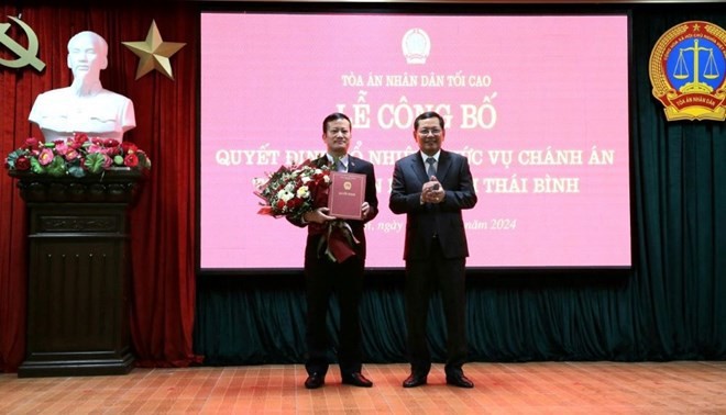 | Phó Chánh án TAND tối cao Nguyễn Văn Du trao quyết định bổ nhiệm, tặng hoa chúc mừng tân Chánh án TAND tỉnh Thái Bình Đỗ Mạnh Tăng. Ảnh: Minh Hưng |