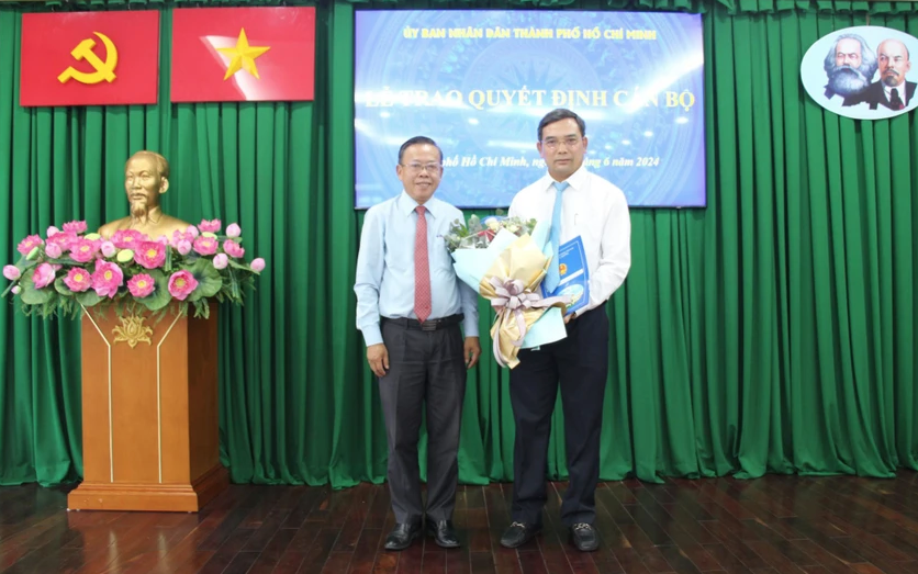 | Bí thư Thành ủy TP. Thủ Đức Nguyễn Hữu Hiệp trao quyết định, tặng hoa chúc mừng ông Đỗ Anh Khang, Phó Chủ tịch UBND TP. Thủ Đức. Ảnh: Thanh Thuỳ |