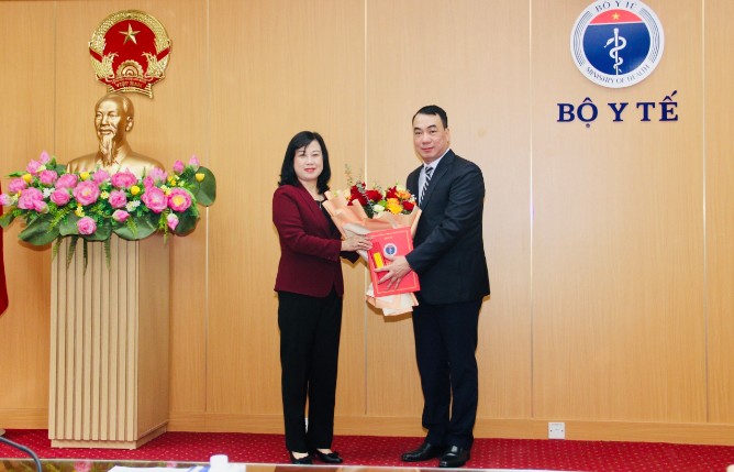 | Bộ trưởng Bộ Y tế Đào Hồng Lan trao quyết định bổ nhiệm chức vụ Cục trưởng Cục Khoa học Công nghệ và Đào tạo (Bộ Y tế) cho TS.BS Nguyễn Ngô Quang |