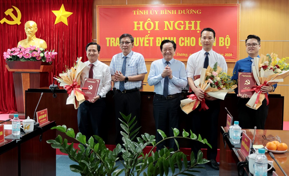| Ông Nguyễn Hoàng Thao (giữa) - Phó Bí thư Thường trực Tỉnh ủy và ông Mai Hùng Dũng (thứ 2 từ trái qua) Phó Chủ tịch Thường trực UBND tỉnh Bình Dương trao các Quyết định điều động, bổ nhiệm cán bộ. (Ảnh: B.D) |