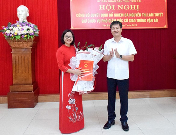| Phó Chủ tịch UBND tỉnh Ngô Hạnh Phúc trao quyết định bổ nhiệm bà Nguyễn Thị Lâm Tuyết - Phó Giám đốc Sở Giao thông Vận tải. Ảnh: yenbai.gov.vn |